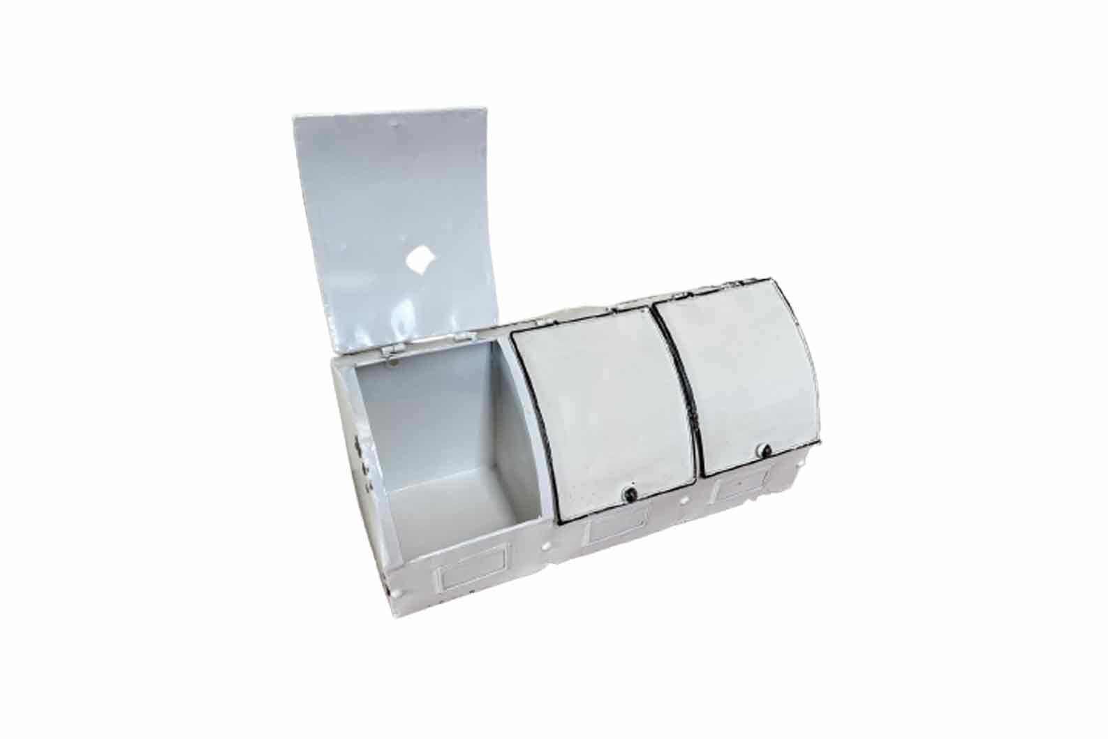 A vintage metal storage. Suitable for travel and vintage themes. Compartments can be opened.